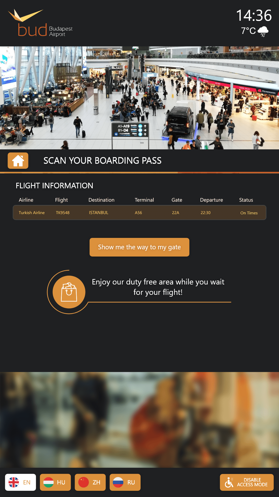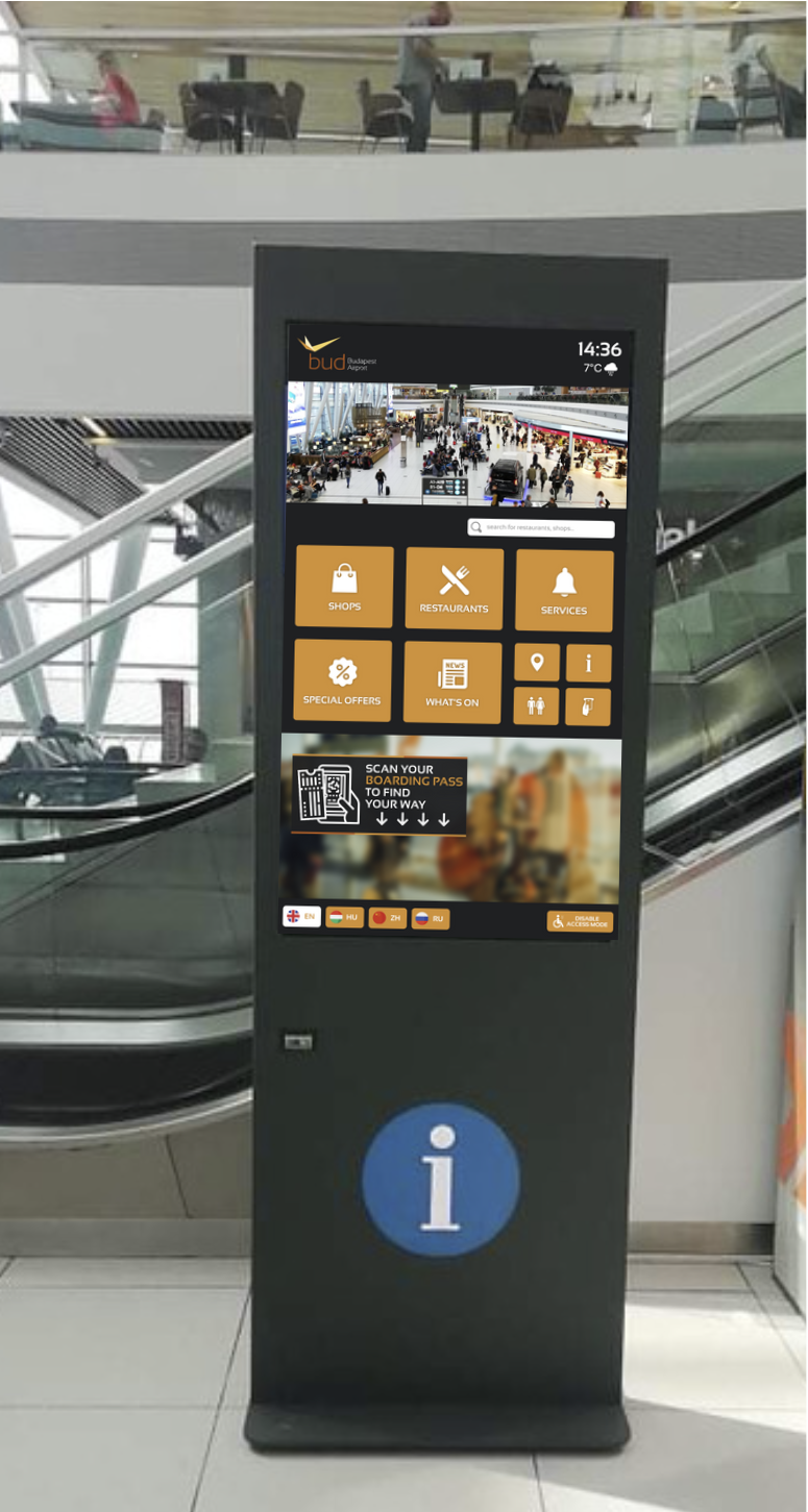 The software developed by ViaDirect enables the display of essential information such as boarding gates, departures, and arrivals. All shops, services, and restaurants are displayed as destinations on the 3D map of the airport. In addition, the kiosks include a QR Code reader to scan boarding passes and show passengers all the information they need to arrive at their gate. The software interface has been custom-developed for the airport, in Hungarian and English.