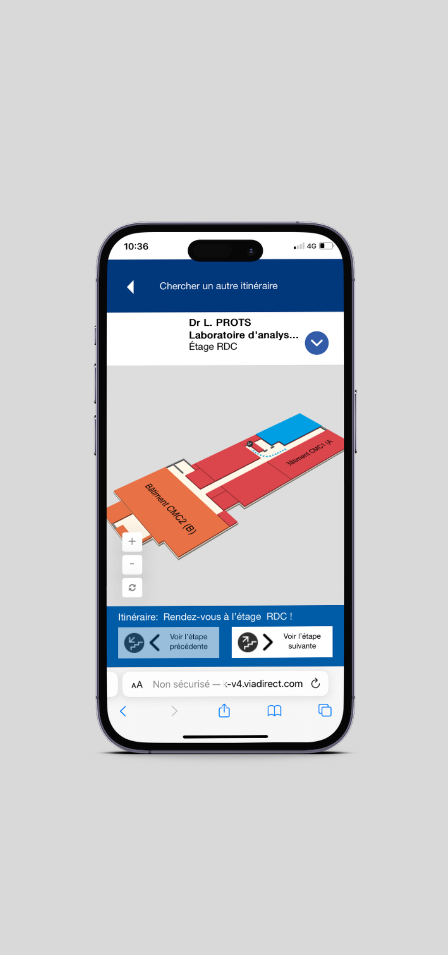 Viadirect directs visitors and patients to the simplest and most intuitive path. They can find a building, a registry office, or even a patient’s room, as quickly as possible. They see the shortest distance, as well as the access conditions. For example, elevator access instead of stairs. Then, this wayfinding solution reduces the stress associated with finding a waiting room or building, and means less time is spent in hospital. They leave satisfied and relaxed, thanks to a smooth, pleasant experience.