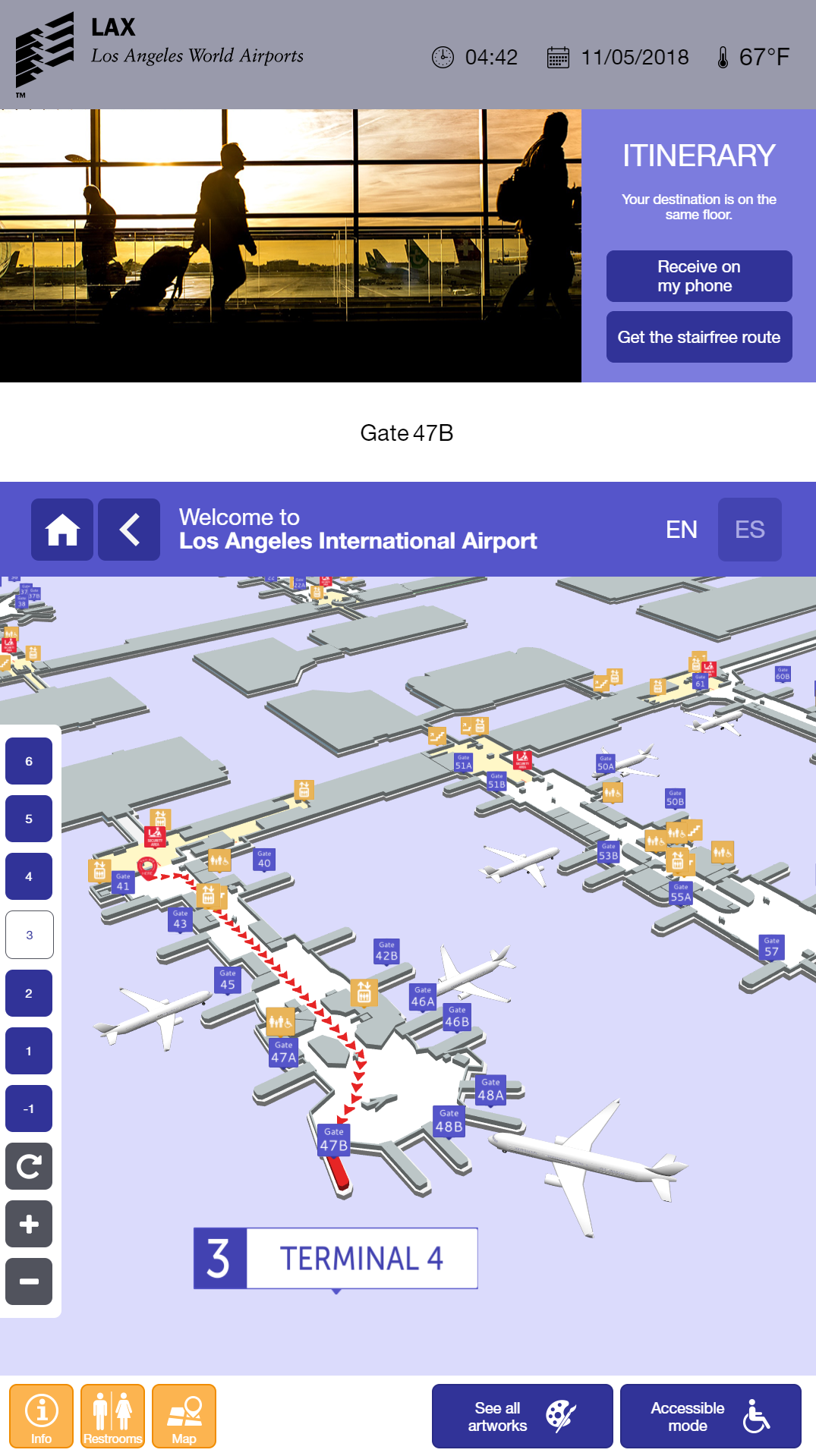 Each kiosk displays the interactive 3D wayfinding software ViaDirect for location and access to all terminals, gates, shops and services with the help of a 3D map representing the 10 terminals of the airport.