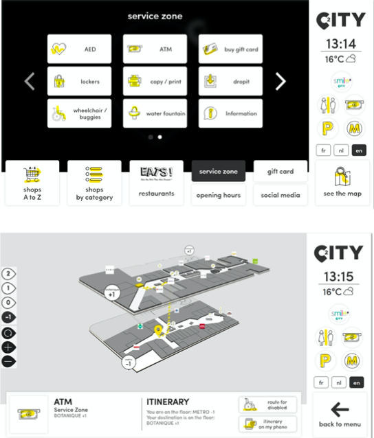 JCDecaux, our partner, has installed 7 kiosks with the ViaDirect wayfinding software. This operating system offers an interactive solution which facilitates the access to the different shops and restaurants and allows the visitors to interact intuitively with the 3D map that represents all the 4 levels of the mall including the parking lot.